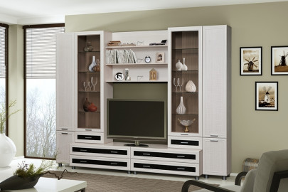 Модульная гостиная Камелия длина 3,1 метра, цвет дуб белёный. Комплектация 01